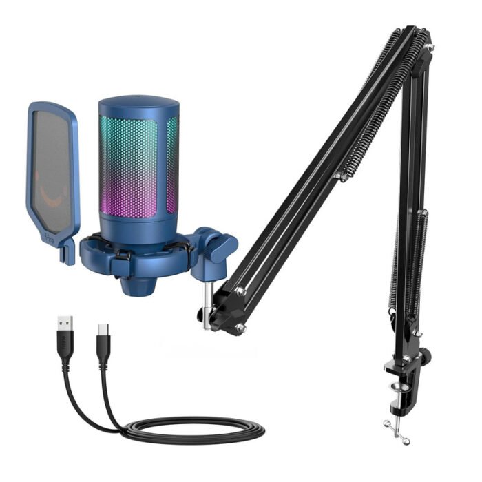Kit de micrófono condensador FIFINE, grabación de juegos USB, paquete de micrófono de computadora RGB color azul
