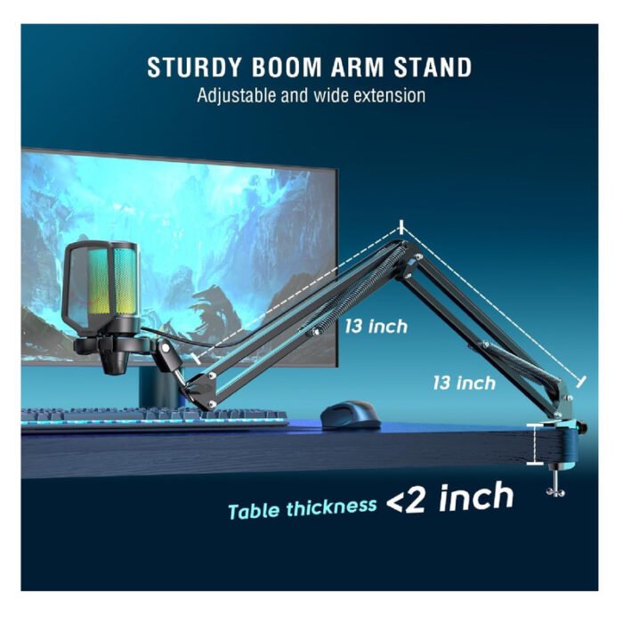 Consejos: 1) El paquete incluye: 1 micrófono de transmisión para juegos con soporte de choque, 1 filtro pop, 1 soporte de brazo con adaptador, 1 cable USB de 8.3 pies (8.2 ft), 1 abrazadera en C, 1 manual de usuario (idioma español no garantizado). 2) La abrazadera en C es adecuada para escritorio con un grosor de menos de o incluyendo 2 pulgadas