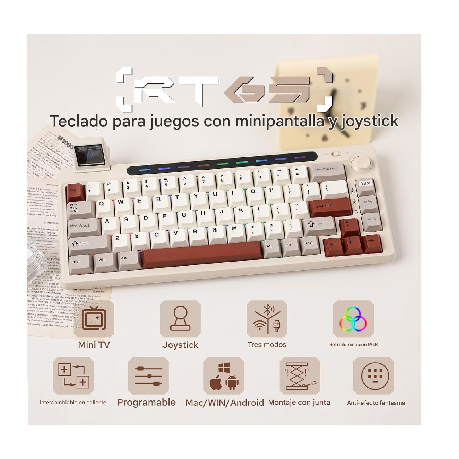 Diseño versátil de joystick: diseño versátil de joystick: sustituyendo la perilla tradicional, el RT65 cuenta con un joystick versátil que se mueve como un mouse, lo que lo hace especialmente conveniente para una navegación rápida sin necesidad de alcanzar un mouse externo. Presionar el joystick actúa como un clic izquierdo del ratón, perfecto para interacciones rápidas. Al presionar FN + joystick, cambia al modo de control de medios, donde el movimiento izquierda-derecha ajusta el volumen, el movimiento hacia arriba y abajo controla la pista anterior/siguiente y presiona hacia abajo silencia el sonido. Esta integración simplifica la multitarea y mejora la eficiencia del flujo de trabajo, ya sea para juegos, control de medios o uso general.