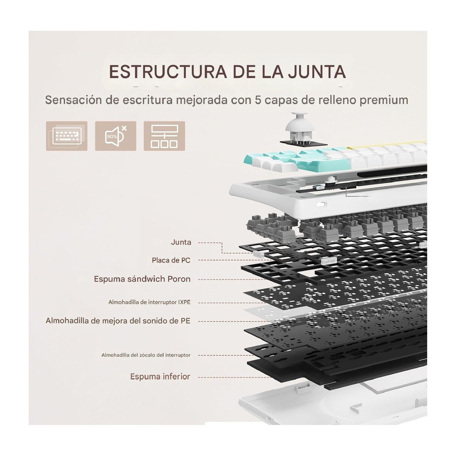 Sensación de escritura mejorada con rellenos premium: para elevar su experiencia de escritura, el RT65 incorpora cinco capas de materiales que mejoran el sonido y la sensación, incluyendo espuma sándwich Poron, almohadillas de interruptor IXPE, espuma de enchufe, película PET y espuma de caja. Combinadas con el soporte de la junta, estas capas amortiguan las vibraciones, suavizan las pulsaciones de teclas y minimizan el ruido, creando una experiencia de escritura profundamente satisfactoria y suave. Los estabilizadores montados en placa finamente ajustados reducen aún más el traqueteo no deseado, asegurando que cada pulsación de teclas sea consistente y agradable.
