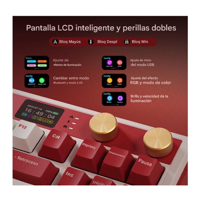 Perillas de control dobles para un fácil acceso: ajusta los ajustes con la perilla izquierda y controla el volumen con la derecha. El teclado mecánico M87 integra todas las funciones clave en estas perillas y se muestra en la pantalla, simplificando la personalización