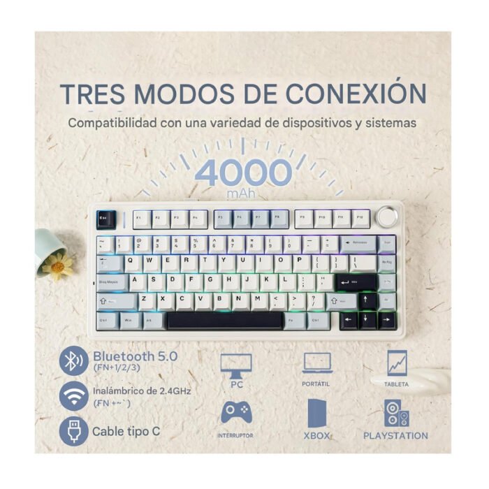 Conectividad de tres vías para cada escenario y batería de 4000 mAh: ofrece Bluetooth, conexión inalámbrica de 2.4 GHz y USB con cable, el F75 se adapta a tus necesidades específicas. Ya sea para una configuración inalámbrica sin desorden o una conexión por cable estable, este teclado está listo para cualquier situación. Equipado con una gran batería de 4000 mAh, el F75 ofrece tiempos de uso prolongados. Esta generosa capacidad de la batería garantiza que su teclado esté siempre listo para largas sesiones de trabajo o maratones intensos de juego.